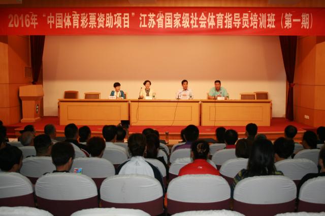 6月2日8:30,2016年“中国体育彩票资助项目”江苏省国家级社会体育指导员培训班(第一期)开班仪式在院报告厅举行。院党委书记陈国祥教授、省体育局群体处副处长吉春英同志、继续教育部主任李勇勤教授、运动营养与健康科学专家张蕴琨教授及继续教育部全体工作人员和来自南京、徐州、南通、扬州、镇江、泰兴的近100位学员出席了开班仪式。