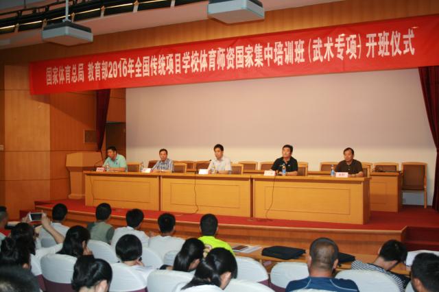 7月10日上午8时30分,国家体育总局 教育部2016年全国体育传统项目学校体育师资国家集中培训班(武术项目)在图书馆报告厅开班,我院党委书记陈国祥教授、国家体育总局教练员学院教练员培训部孙文新部长、首都体育学院李相如教授、我院运动系主任袁野教授、继续教育学部主任李勇勤教授、全体继续教育部员工与来自全国各地的近80名学员参加了开班仪式。