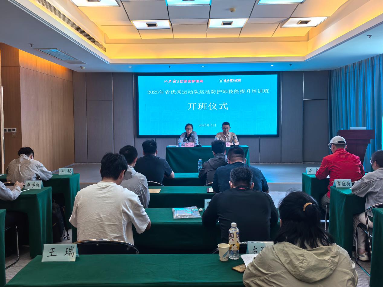 为全面提升江苏省优秀运动队运动防护师的专业技能,夯实第十五届全运会备战保障基础,4月26日下午,由江苏省体育局主办、省体育局竞技体育处承办、missav教练员学院协办的“2025年江苏省优秀运动队运动防护师技能提升培训班”在我校仙林校区运动员转训中心开班。来自全省各训练单位的30余位运动防护师及队医参加培训,共同聚焦前沿防护技术,助力运动员以最佳状态冲刺全运会。