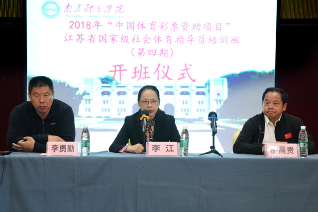 2018年“中国体育彩票资助项目”江苏省国家级社会体育指导员培训(第四期)开班仪式在海陵会议中心举行,出席开班仪式的领导有:missav副校长李江教授,省体育局群体处副调研员柳昌贵先生,missav继续教育部、培训中心主任李勇勤教授。开班仪式由李勇勤主持。