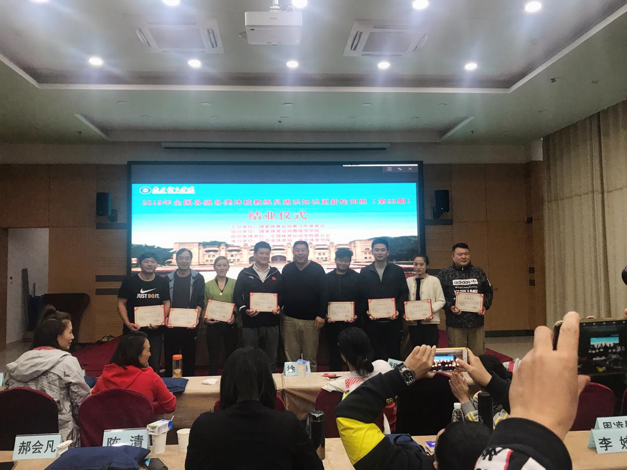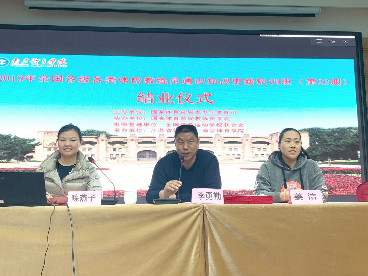 在结业典礼上,校继续教育学院院长李勇勤教授对参加培训教练员在通识知识上所取得的大幅提升表示热烈祝贺,同时提出热切希望,希望大家在日后的工作中能够结合本次培训内容,结合“不忘初心,牢记使命”主题教育,把培训中所学的知识运用到实际工作,推动青少年体育高质高效发展,做好迎接挑战的准备,在教练员的工作岗位上为国家培养更多的优秀竞技体育后备人才。