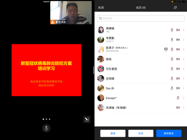 为进一步落实新型冠状病毒肺炎防控方案(第九版)的组织实施和宣传培训工作,切实提升全院常态化疫情防控和应急处置能力,8月9日上午9点,继续教育学院在线开展新型冠状病毒肺炎防控方案(第九版)专题培训会,会议由李勇勤主持,学院全体人员参加。