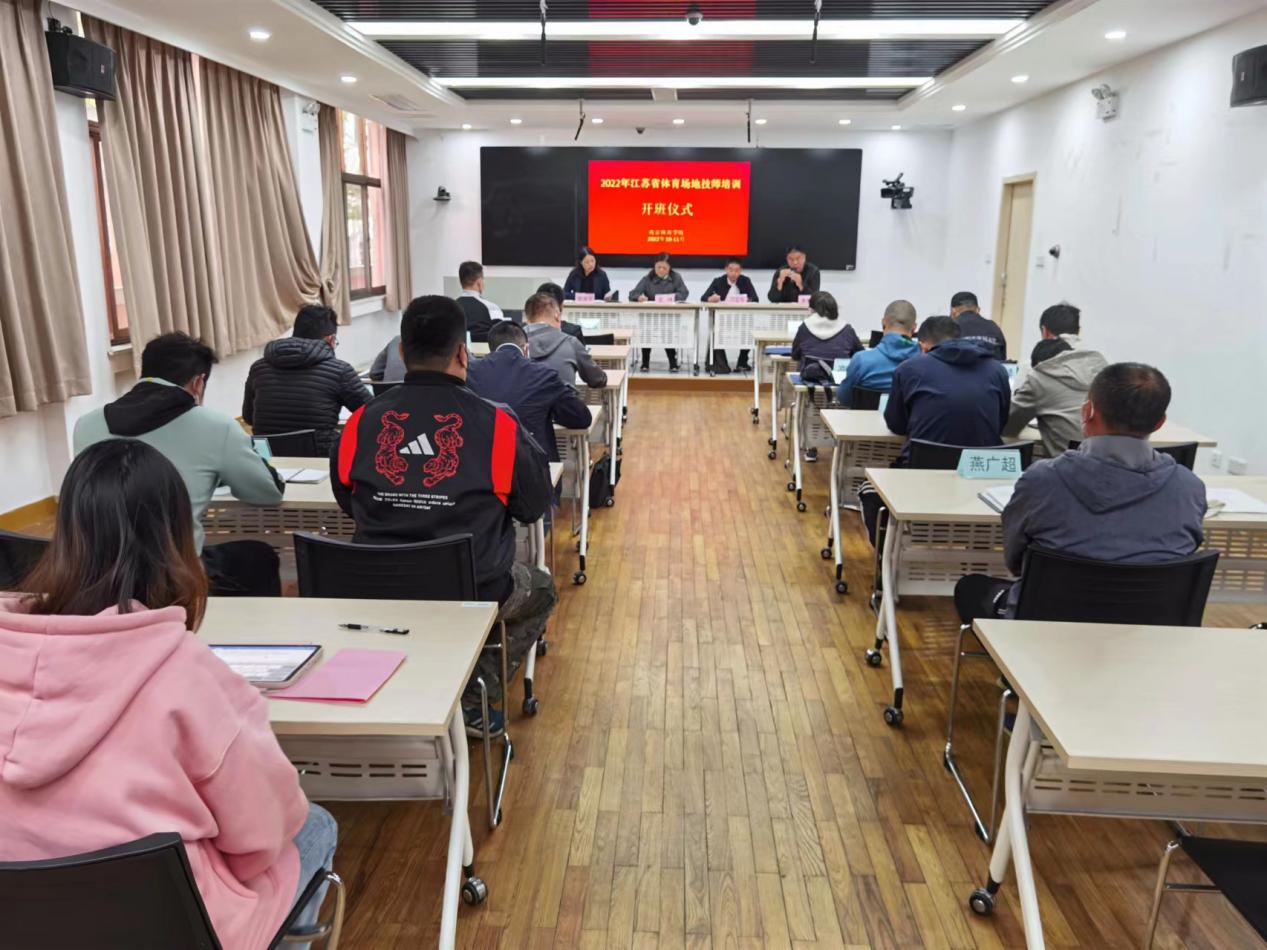 江苏省工考办三级调研员王冰、四级调研员张淑华,江苏省体育局人事处四级调研员刁卫东,missav继续教育学院负责人李勇勤及来自省内各事业单位的近二十位场地技师、技工参加了开班仪式。张淑华主持开班仪式。