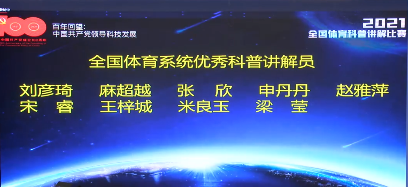 根据《体育总局办公厅关于举办2021年全国体育科普讲解比赛的通知》(体科字[2021]141号)有关要求,我校广泛动员、积极谋划,统筹资源大力支持参赛选手的比赛筹备工作。经过激烈的比赛角逐,我校三名推荐选手凭借过硬的实力、丰富的知识和专业的讲解,全部斩获荣誉。