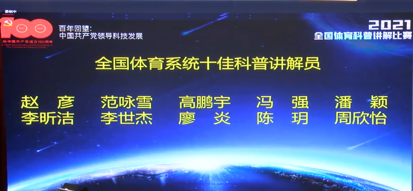8月27日上午,由体育总局科教司主办,武汉体育学院承办的2021年全国体育科普讲解大赛圆满落下帷幕。我校运动健康学院教师赵彦、科学实验中心实验员潘颖以第一、第五名的成绩荣获“全国体育系统十佳科普讲解员”称号,运动健康学院教师张欣荣获“全国体育系统优秀科普讲解员”称号。