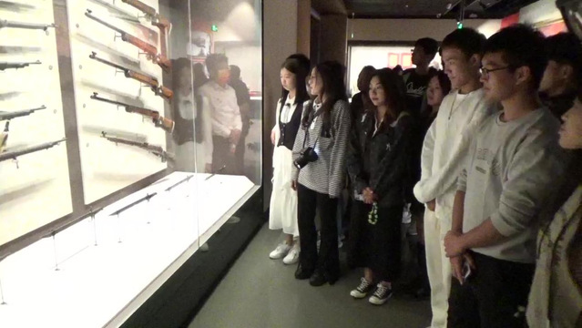学生们在渡江战役武器展览柜前驻足观看