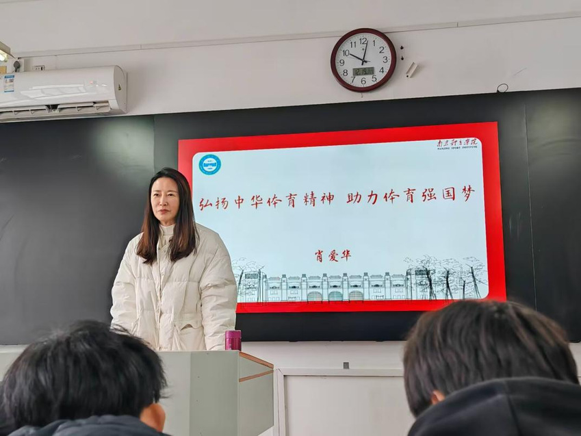 为促进思政课的改革创新,弘扬中华体育精神,12月19日上午,党委常委、副校长肖爱华走进思政课堂,为2023级休闲体育专业学生讲授“弘扬中华体育精神,助力体育强国梦”专题思政课。