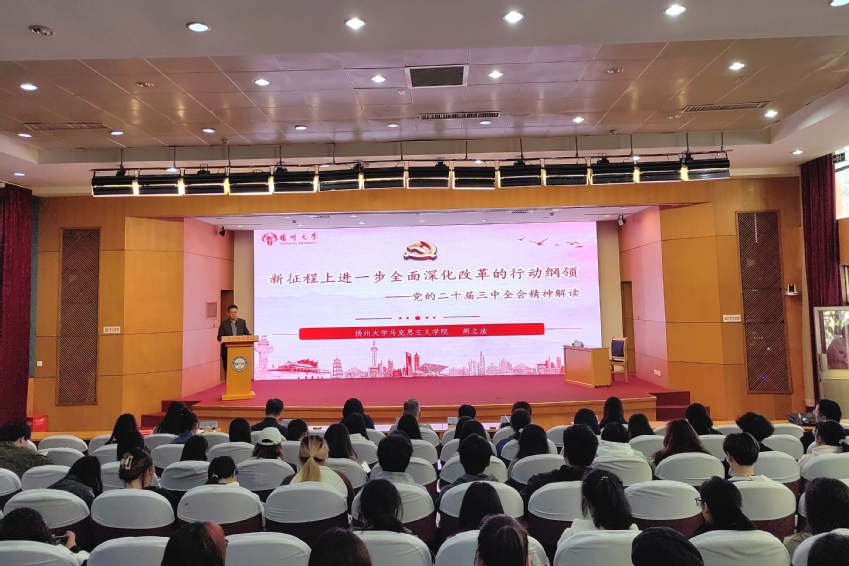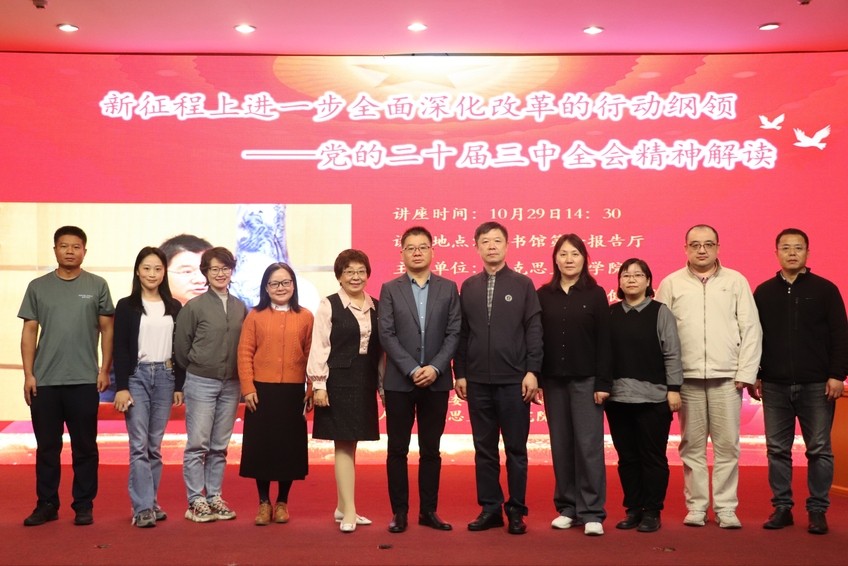 10月29日下午,马克思主义学院举办党的二十届三中全会精神专题讲座暨马克思主义学院直属党支部与运动健康学院党总支理论学习中心组联学活动。会议特邀扬州大学马克思主义学院院长胡立法教授作《新征程上进一步全面深化改革的行动纲领——党的二十届三中全会精神解读》专题辅导报告。校党委常委、副校长刘健莅临指导。会议由校科研处处长赵彦主持。本次活动由马克思主义学院主办,科研处和运动健康学院协办。校科研处领导,马克思主义学院直属党支部、运动健康学院党总支理论学习中心组全体成员和运动健康学院学生代表参加了本次学习。