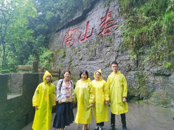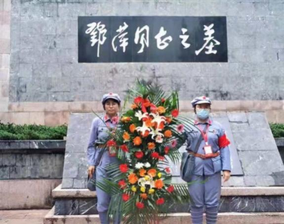 为继承红色基因、传承革命精神,团队成员走进坐落于遵义市凤凰山麓小龙山上的红军烈士陵园。在绵绵细雨中,走进陵园大门,沿317级青石阶而上,气势磅礴的“红军烈士纪念碑”映入眼帘,这座纪念碑是1984年为纪念遵义会议50周年而建造,正面是邓小平同志在那年11月2日题写的“红军烈士永垂不朽”八个大字。解放后,遵义人民在战场遗迹找到77位红军烈士坟墓,陆续将烈士遗骸迁至这里的陵园,纪念碑后方就是红三军团参谋长邓萍将军的陵墓,邓萍将军是红军长征中牺牲的唯一一位军团级将领。在敬献花篮后,葛翠柏走上前仔细郑重地整理挽联,全体成员鞠躬致敬并默哀以表缅怀之情,在场党员重温入党誓词。