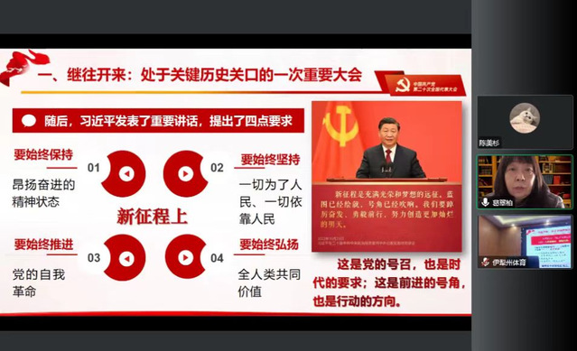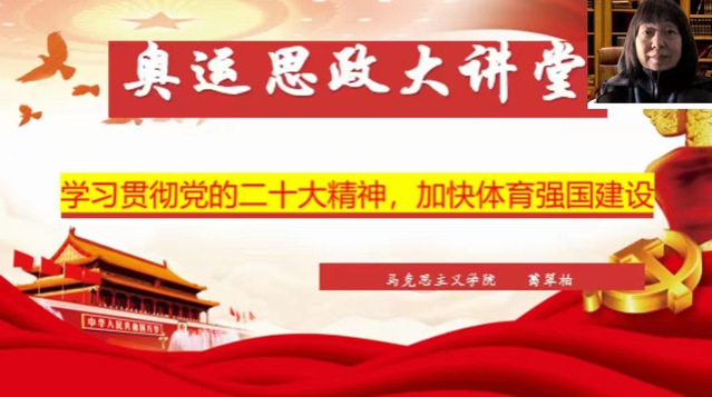 党的二十大指出:广泛开展全民健身活动,加强青少年体育工作,促进群众体育和竞技体育全面发展,加快建设体育强国。学习宣传贯彻党的二十大精神是当前和今后一个时期全党全国的首要政治任务。3月18日上午,马克思主义学院直属党支部书记葛翠柏应邀为江苏援疆对口城市:伊犁州体育局做了题为《学习贯彻党的二十大精神,加快体育强国建设》的线上讲座。讲座由伊犁州体育局综合处处长何泽虎主持。
