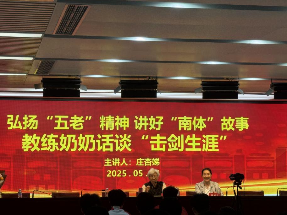 庄杏娣结合自身60余年体育生涯,分享了从运动员到金牌教练的奋斗历程。她回顾了带领江苏女子花剑队连续14年蝉联全国冠军的辉煌成就,以及退休后投身残疾人击剑事业、培养18名残奥冠军的感人故事。她表示:“体育精神的核心是超越自我、永不言弃,这不仅是竞技场上的信念,更是人生的底色。”其讲述的细节,如运动员带伤训练、轮椅击剑队的突破性训练方法,生动展现了“五老”精神中“忠诚、关爱、创新、奉献”的深刻内涵。