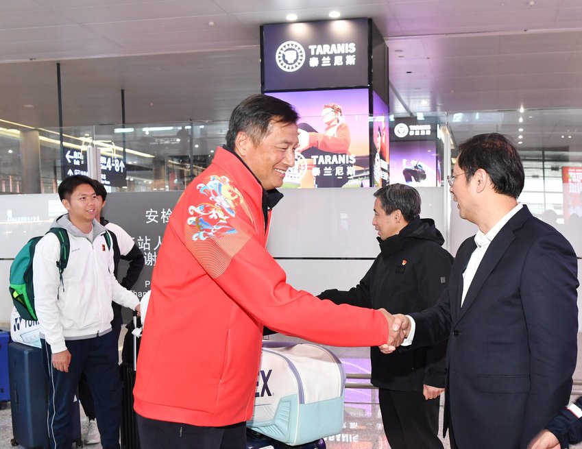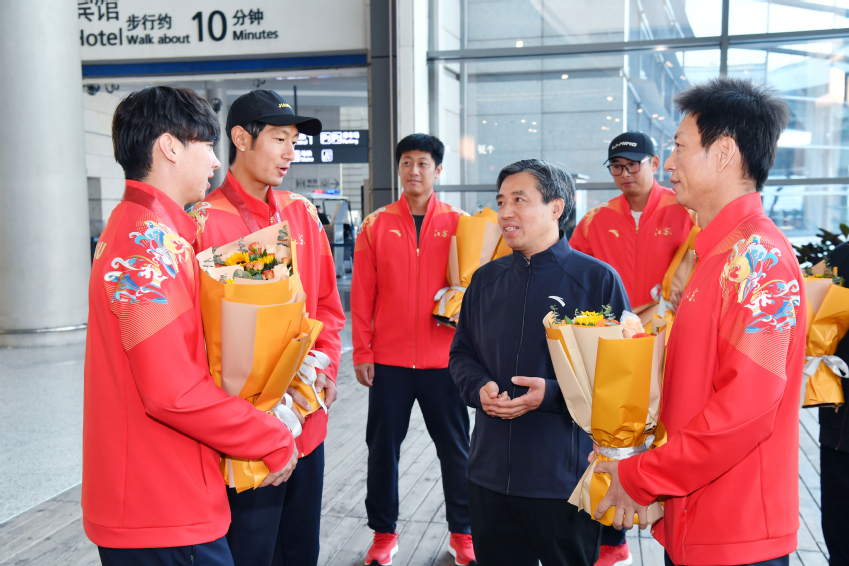 校领导与运动员、教练员握手欢迎他们归来