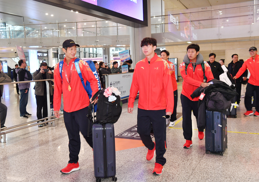 在出站通道处,网球队全体队员受到了来自母校师生的热烈欢迎。参与迎接的领导向全体运动员、教练员和管理保障团队送上了鲜花。刘红明对网球队在第十五届全国运动会中展现的竞技风采给予了高度评价,特别称赞唐盛、孙浅等运动员以优异表现为校争光、为省增光的卓越表现。他希望全体运动员继续发扬体育精神,在未来的国际国内赛场上再攀高峰,为学校和江苏体育事业作出新的更大贡献。