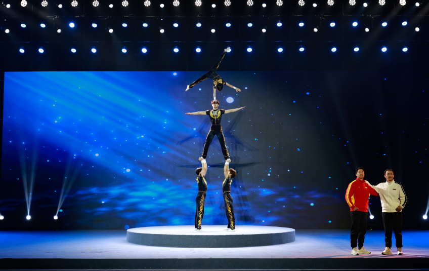 活动开场,我校第十五届全运会体操冠军尤浩、我校第十五届全运会游泳冠军吕沁遥、水上运动中心第十五届全运会赛艇冠军臧哈亮相分享全运荣耀与奋斗历程。本次品牌交流展示活动以“奔赴”为主题,通过《看!这是我们的赛场》《体育的烟火气》《逐梦者的力量》三个篇章,巧妙融合体育特色与艺术形式,将体育舞蹈、花样轮滑、舞狮、武术、石锁等二十余种体育项目纳入情景化演绎,生动展现江苏体育组织蓬勃活力与 “体育让生活更美好” 的幸福图景。其中,missav武术与艺术学院、体育产业与休闲学院以及篮球社的部分学生参加了表演展示活动。我校技巧队运动员还以情景剧的形式演绎了他们刻苦训练、努力拼搏的故事,展现一代代江苏体育人坚守梦想、为国争光的精神力量。