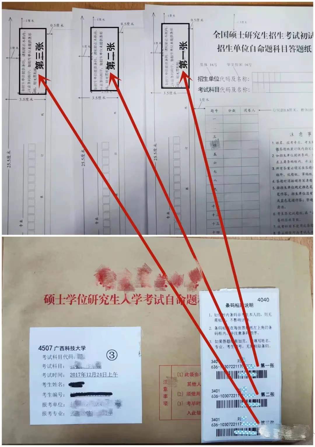 第3步:如信息一致,请将条形码按照编号顺序,分别粘贴到第一张、第二张和第三张答题纸的条形码框中。请注意,三张条形码和三张答题纸都有“第X张”字样,请务必一一对应按序粘贴。在三张答题纸上都填写姓名、考生编号、报考专业等信息。
