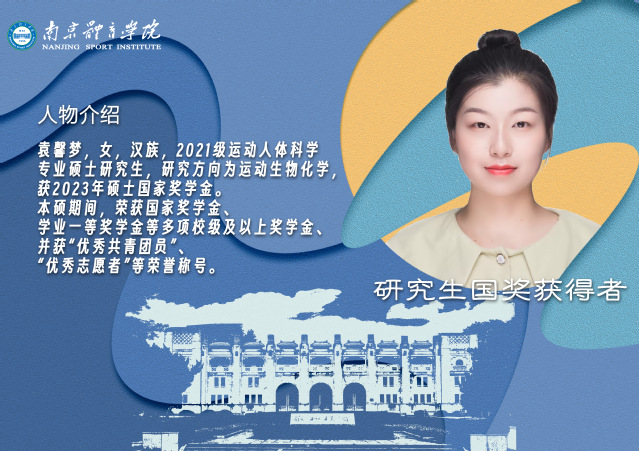 学然后能行,思然后有得。在研究生期间,袁馨梦积极参加运动生理、运动生化领域国内外学术会议,于2022年5月参加了ACSM年度会议,并做墙报交流;2022年8月参加了江苏省第六届体育科学大会,并做专题报告,获一等奖;2023年3月参加了missav第十五届科学论文报告会,并做专题报告,获一等奖;2023年10月参加了中国生理学会学术年会,并做墙报交流和口头汇报;2023年11月参加了第十三届全国体育科学大会,并做专题报告。还先后获得国家奖学金、学业一等奖学金(连续两年)等。在读期间完成江苏省研究生科研创新计划项目1项,并参与导师国家自然科学基金项目1项。