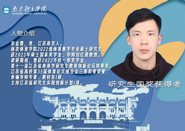 在导师的精心指导下,吴金霖从跨学科的懵懂快速进入角色,对体育科学研究有了一定的认识和自己独特的见解。他参与导师专著《中外青少年和学校体育政策演进及借鉴》第五章“澳大利亚的青少年和学校体育政策”的撰写工作;也参与了教材《学校体育政策导论》第五章、第八章的撰写工作。研一暑假期间,在《吉林体育学院学报》《江苏教育研究》各发表论文1篇。吴金霖还经常参加学术会议交流,通过思想的碰撞迸发出不少智慧的火花。在2023第十三届全国体育科学大会录用专题报告、墙报交流各1篇;2023年第十一届江苏省体育学研究生教育创新论坛获得特等奖;2023年第十一届全国体育管理科学大会录用墙报交流1篇;江苏省高校第35届体育论文报告会获得三等奖;2023国际体育课程教学改革与发展学术论坛进行专题汇报1篇。在校期间,他主持了2023 年江苏省研究生实践创新计划1项,参与江苏省教育科学“十四五”重点课题1项。这是他学术之路的开端,路漫漫其修远兮,他将上下而求索。同时他坚信:道阻且长,行则将至;行而不辍,未来可期。