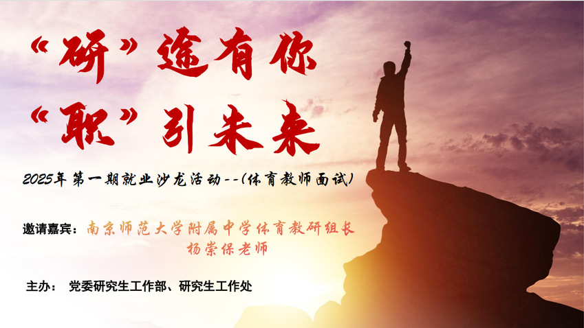 4月25日,由党委研究生工作部、研究生工作处主办的2025年第一期“研”途有你,“职”引未来就业沙龙活动——(体育教师面试专题)活动在图书馆第一报告厅成功举办。本次讲座特邀南京师范大学附属中学体育教研组长杨崇保老师作为主讲嘉宾。活动由辅导员唐玮鸿主持,吸引了众多学生参与。
