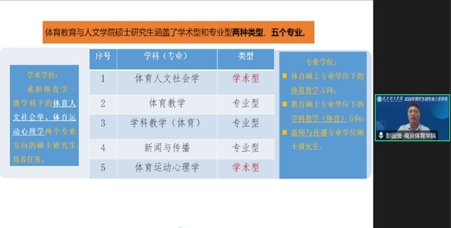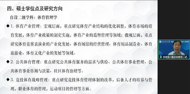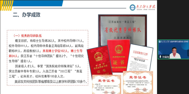 6月19日,研究生工作处组织了2026年硕士研究生招生宣讲直播。研究生工作处处长孙国友、体育教育与人文学院院长彭国强、运动训练学院院长赵琦、运动健康学院院长汤强、武术与艺术学院院长张明、体育产业与休闲学院院长郭修金参加了宣讲。孙国友在直播中和广大考生及考生家长分享了我校研究生培养特色、奖助体系和以往人才培养取得的成绩,并重点解读了2026年我校研究生招生新政策。五位院长分别为考生们介绍了学院办学特色、研究生培养、导师团队、科研成果和研究生就业等内容。在提问答疑环节,各位院长就考生重点关注的报考专业、教学设施、就业前景等问题在线予以逐一解答。