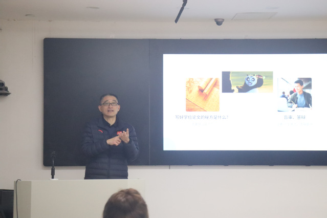在学位论文写作能力提升指导环节,史曙生教授以“写好学位论文的秘方”引入,强调观察、思考、写作三大步骤,并指出逻辑思维是贯穿其中的核心能力。史曙生认为,学位论文写作是系统研究、规范表达与知识创造的过程,也是履行学术契约的体现。他通过互动提出观察能力框架:选题、备题、做题,并提醒学生警惕技术依赖,坚持人本思考。最后,他提出学术写作需具备结构逻辑、语言规范与论述思辨能力,鼓励学生从模仿起步,完成独立研究,实现从学习到超越的转变。