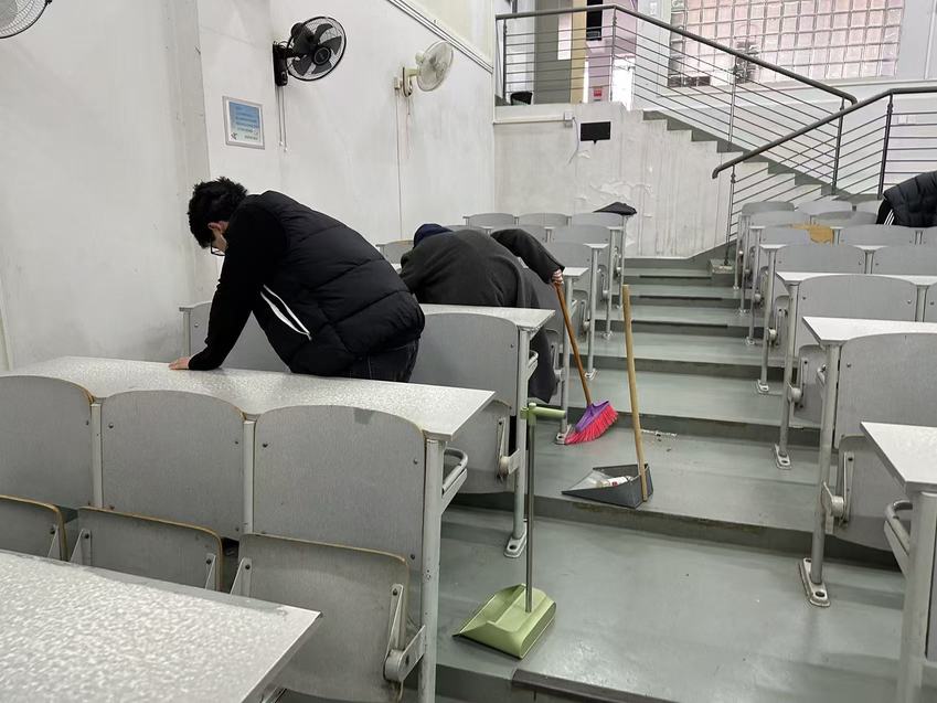针对公共教室课桌涂鸦、污渍等问题,专硕二班入党积极分子开展了“课桌文化”清除行动。12月5日下午,由殷梦婷、陈亮带队,10名学员参与,对一号教学楼阶二、阶三教室进行了专项清洁。活动实行分组协作、流程化管理:工具组负责物资准备与回收,清洁组利用橡皮、小刀等工具细心清除课桌涂鸦与顽固污渍,并同步完成黑板擦拭、地面清扫等任务;收尾组统筹验收,确保清洁质量。通过精细化分工与闭环管理,教室环境得到全面改善,学员们在劳动中强化了责任意识与协作能力,践行了爱护公物、服务校园的承诺。