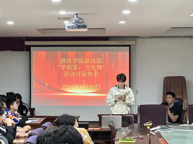 为进一步激发游泳队学习先进、争当先进的热情,全面加强优秀运动队的思想道德与作风建设,4月30日晚,游泳学院游泳队在运动员公寓二楼会议室开展“学雨霏 当先锋”大讨论活动。此次活动由游泳队副领队孙世昆主持,游泳队全体教练员及运动员参加本次活动,共同学习并感受张雨霏的拼搏奋斗精神。