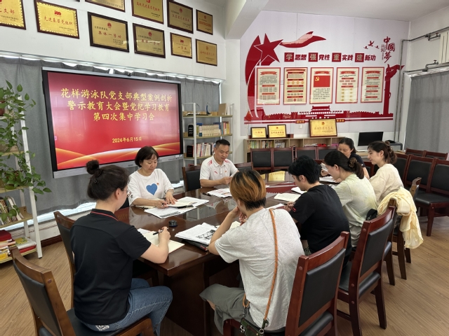 为做好党纪学习教育工作,推动廉洁文化深入人心,进一步教育引导全体党员学纪、知纪、明纪、守纪,根据校纪委《关于组织开展典型案例剖析的工作通知》,6月15日,花样游泳队党支部在跳水花游馆二楼会议室开展典型案例剖析警示教育大会暨党纪学习教育第四次集中学习会。会议由花游队党支部书记叶雷雷主持。