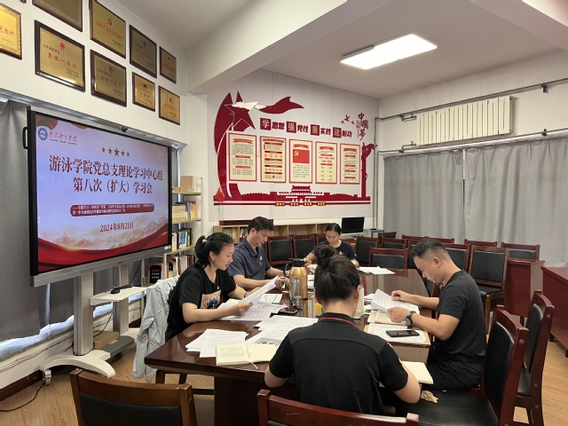 8月21日上午,游泳学院党总支在跳水花游馆二楼会议室召开理论学习中心组第八次(扩大)学习会,专题学习贯彻党的二十届三中全会精神。会议由学院党总支书记骆晓娟主持,全体管理干部参加学习。