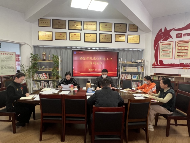 3月14日上午,游泳学院在跳水花游馆二楼会议室召开意识形态工作专题会议。学院党总支书记骆晓娟主持会议。学院全体管理干部参加会议。