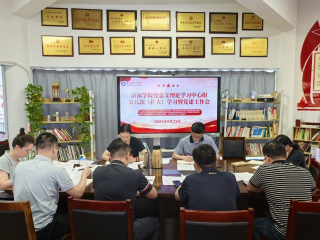 9月25日上午,游泳学院党总支在跳水花游馆二楼会议室召开2025年理论学习中心组第八次(扩大)学习会暨党建工作会议。会议由学院党总支书记骆晓娟主持,全体管理干部参加学习。