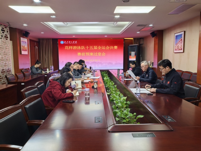 10月25日下午,游泳学院花样游泳队在行政办公楼301会议室召开十五届全运会决赛预案过堂会。党委常委、副校长刘健出席会议。训练处副处长宋凯、游泳学院党总支书记骆晓娟、院长王伟新、花游队全体管理干部、一线教练员、体能教练及科医保障人员参加会议。会议由王伟新主持。