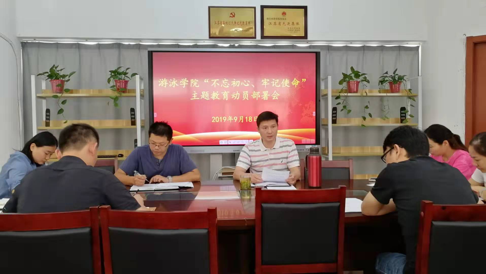 9月18日上午,游泳学院在跳水花游馆二楼会议室召开“不忘初心、牢记使命”主题教育动员部署会,游泳学院党总支全体党员参加了会议。会议由游泳学院党总支副书记陈志主持。