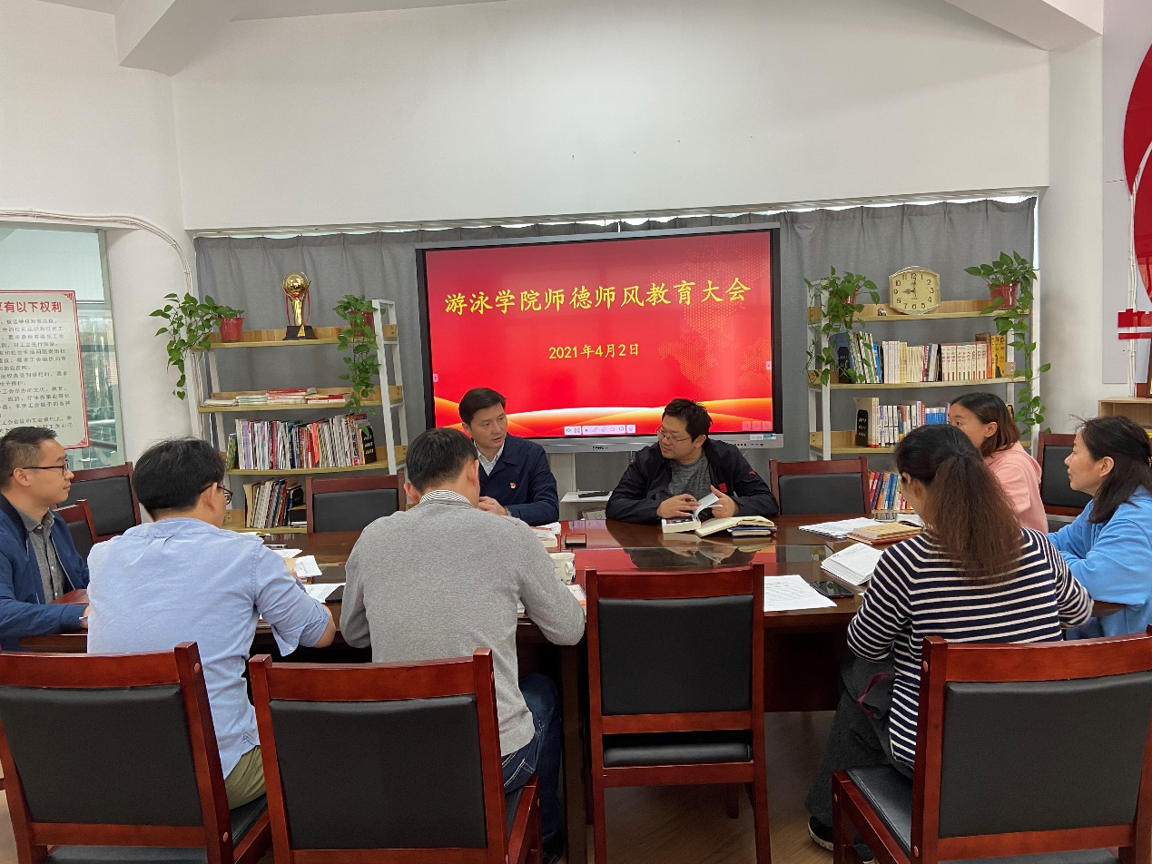 2021年4月2日,游泳学院在跳水花游馆二楼会议室召开师德师风教育会议对游泳学院2021年师德师风建设工作进行研究部署。游泳学院全体管理干部参加了会议,会议由党总支书记、院长王伟新主持。