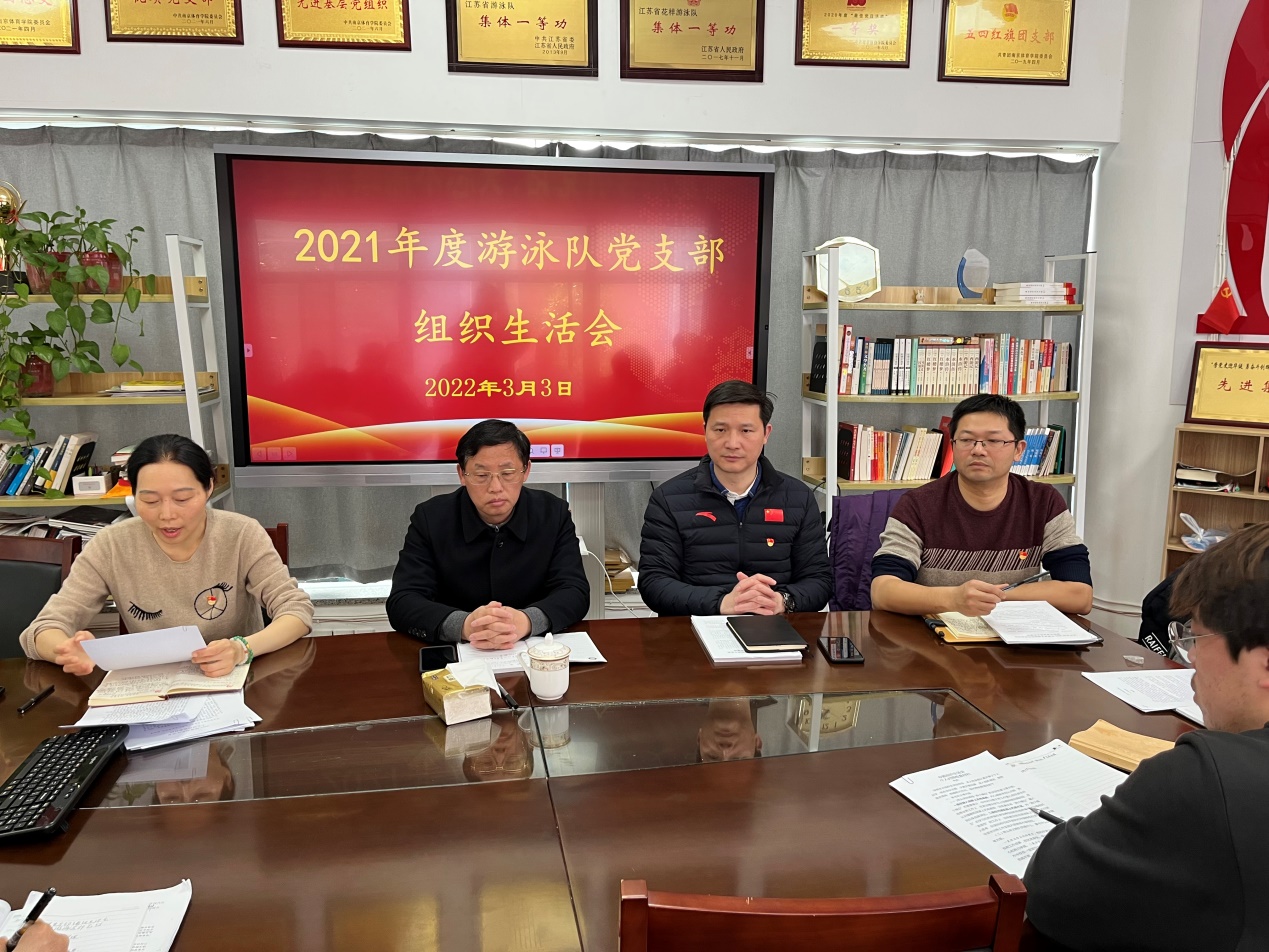 3月3日上午,游泳队党支部在跳水馆二楼会议室召开组织生活会,集中开展2021年度民主评议党员工作。校党委常委、总会计师黄步龙以普通党员身份参加会议,游泳学院党总支书记、院长王伟新列席会议,在南京的游泳支部党员全体到会。会议由游泳队党支部书记张纪芳主持。