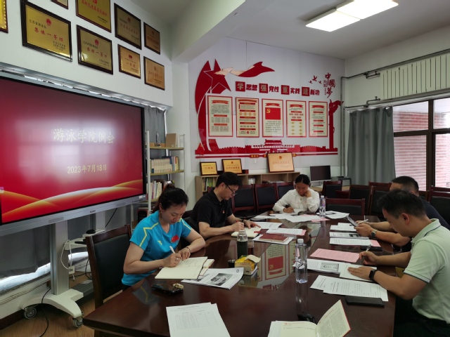 7月18日上午,游泳学院在跳水花游馆二楼会议室召开2023年夏训工作推进会暨missav优秀运动队异地转训责任书签订仪式。学院全体管理干部参加会议。会议由游泳学院院长王伟新主持。
