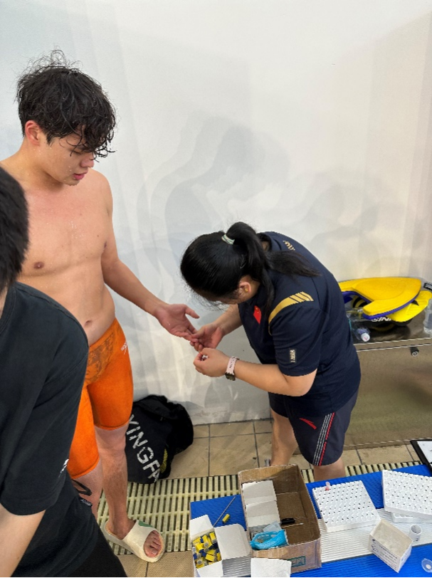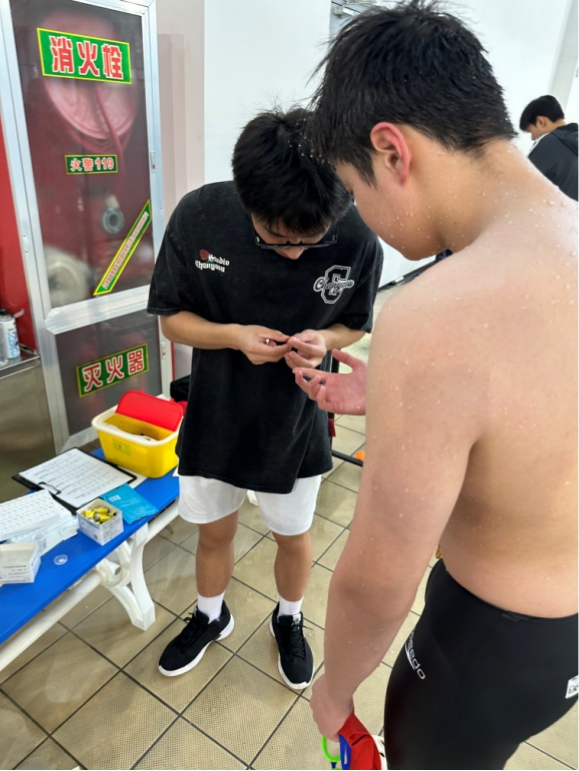 在江苏游泳队的精心组织安排以及全体教练员、工作人员和淮安体校专项教练员们的全力配合下,游泳队分别通过8月30日下午、31日上午以及31日下午的三场比赛,成功完成了夏训阶段的第一次测验赛。本次测验项目主要是单项测验,每名运动员上报两个短距离或中长距离项目和一项1500米自由泳测验,主要考察运动员的主项训练成果、主项爆发能力以及有氧能力水平。同时在本次测验中引入科技助力,每项测试完成后,立即对运动员进行末梢采血,检查测验结束后运动员血乳酸情况,让教练员们能够结合测验成绩以及血乳酸值,综合评估运动员的训练成果和能力水平。
